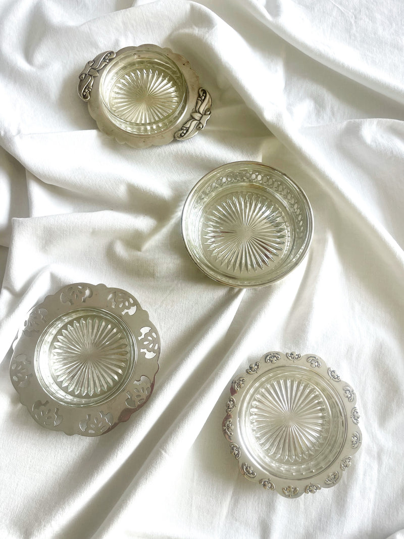 Add a touch of elegance to everyday dining or special occasions. Vintage silver-plated dish traditionally used for serving sweets, nuts, or condiments, can even be used as a wine bottle coaster, butter and jam dish, candle or trinket holder. The cut glass sunburst pattern adds extra dimension and sparkle to your tabletop.
